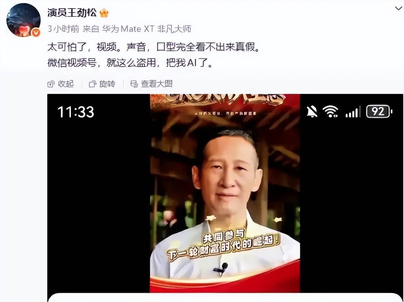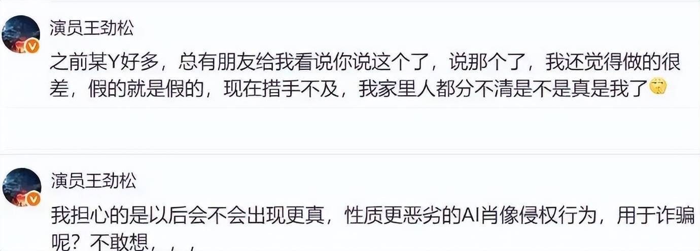 我觉得最可怕的不是明星被盗脸,而是连王劲松这种级别的名人都要亲自下场打假,甚至他自己都很难证明那个视频是假的 。